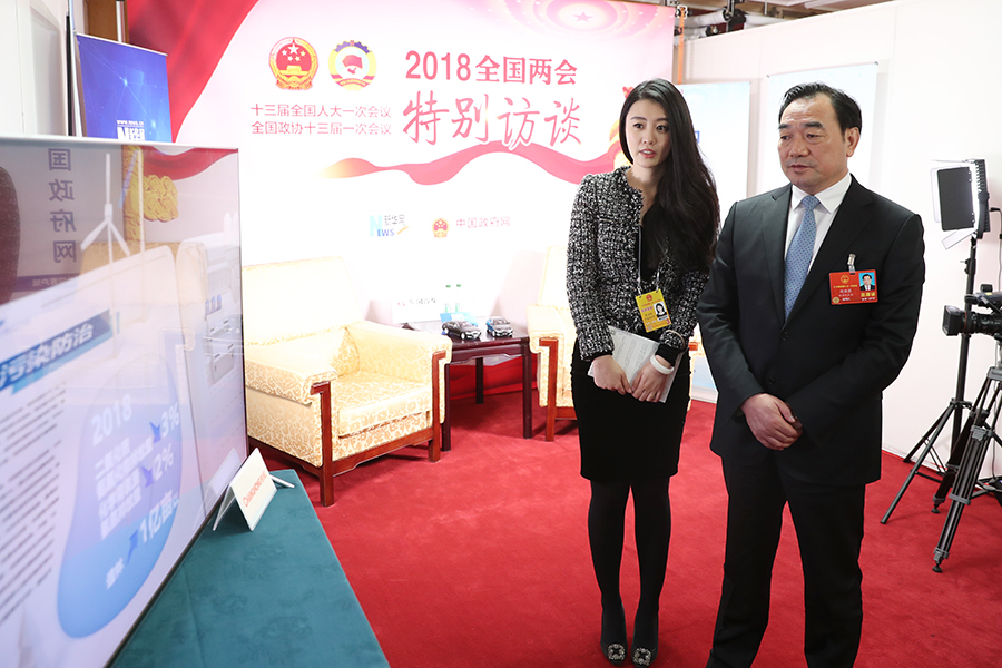3月20日,全國人大代表、江蘇省徐州市市長周鐵根在新華網(wǎng)人民大會堂兩會特別訪談間內(nèi)觀看新華網(wǎng)創(chuàng)意視頻產(chǎn)品《躍然紙上看報(bào)告》。新華網(wǎng) 郝廣鵬 攝