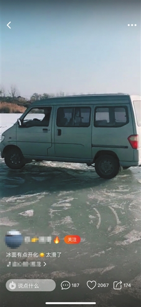 新京報(bào)記者在“快手”、“抖音”、“火山小視頻”、“西瓜視頻”等平臺(tái)搜索發(fā)現(xiàn),面包車、越野車、小轎車甚至拖拉機(jī)、大卡車都是河湖冰面撒歡兒的主角,旋轉(zhuǎn)漂移、快速?zèng)_刺,隨著司機(jī)發(fā)出歡呼聲,車上的乘客被嚇得尖叫。