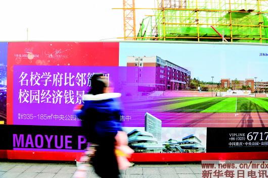 ▲1月16日,重慶渝北中央公園,一位市民抱著孩子從寫有“名校學府”字樣的房地產廣告前走過。在重慶,許多樓盤將中小學名校作為賣點進行宣傳營銷。記者王全超攝
