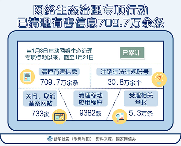 新華社北京1月23日電(記者史競男、白瀛)記者23日從國家網信辦獲悉,自1月3日啟動網絡生態治理專項行動以來,截至1月21日,已累計清理有害信息709.7萬余條,注銷違法違規賬號30.8萬余個,關閉、取消備案網站733家,清理移動應用程序9382款,受理相關舉報5.3萬條。