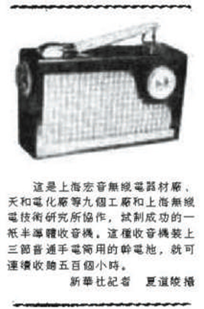 ??? 編者按: 1958年3月13日,人民日報報道我國第一臺半導體收音機在上海誕生。