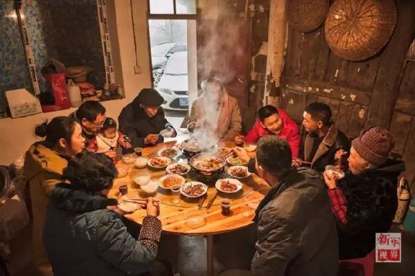 湖北省建始縣花坪鄉(xiāng)張家槽村的一戶家庭圍坐一起吃團(tuán)圓飯。新華社發(fā)(周阿寒 攝)