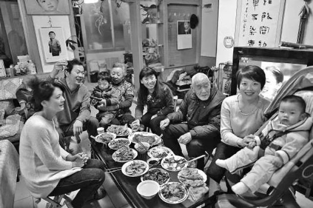 ↑1953年,天津市漢沽區蘆臺王德鑄(左一)一家吃團圓飯。