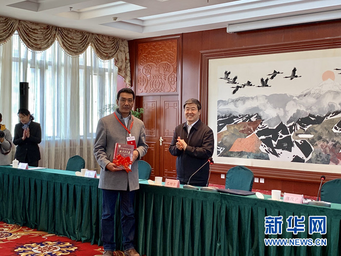 全國政協(xié)副主席、國家民委主任巴特爾(右一)向相關(guān)單位贈書。新華網(wǎng) 王頔 攝