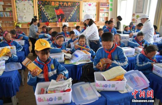 資料圖:藏區孩子們正在查看自己收到的愛心包。 劉忠俊 攝