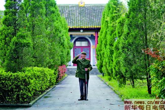 3月27日,程樟柱在紀念館內向前來參觀的游客行軍禮。