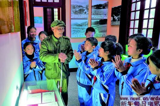 3月28日,程樟柱在紀念館內給前來參加傳統革命教育的學生講故事。