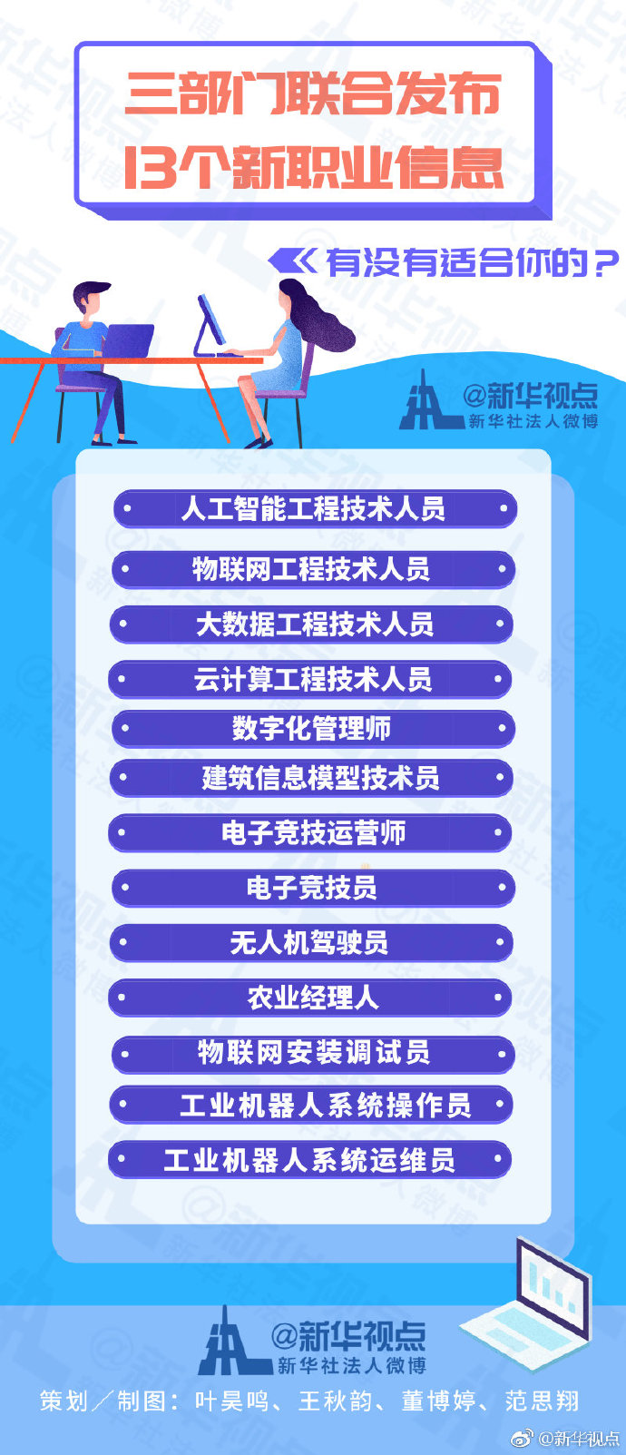 “新職業是在向社會公開征集的基礎上,經專家評審、公示征求意見后,按程序遴選確定的。”人力資源社會保障部有關負責人表示,此次共征集到43個建議職業,經專家嚴格評審,報人力資源社會保障部、國家市場監管總局、國家統計局批準,最終發布了上述13個新職業信息。