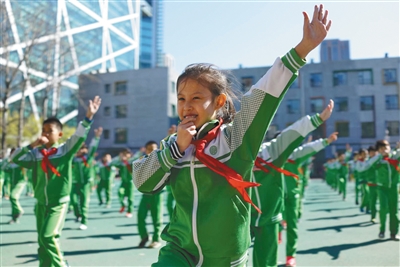 新京報(bào)記者走訪北京中小學(xué)發(fā)現(xiàn),動(dòng)感活潑的音樂(lè)和流行的動(dòng)作更能激發(fā)同學(xué)的鍛煉熱情,尤其是那些跳慣了傳統(tǒng)廣播體操的高年級(jí)學(xué)生。為此,北京一些學(xué)校通過(guò)自編操提升學(xué)生興趣,武術(shù)、跳繩等動(dòng)作和流行音樂(lè)也融入了課間操中。