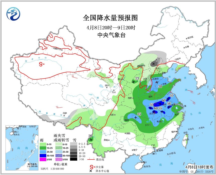 張濤:降水的主要影響時間為8日夜間到9日白天。北方地區(qū)以大范圍小到中雨的穩(wěn)定性降水為主,無雷電,影響區(qū)域主要集中在西北地區(qū)東部、內(nèi)蒙古中部、華北、黃淮等地。河北南部、河南北部、山東西部等地會達到大雨量級。除此之外,北方部分地區(qū)降水會經(jīng)過雨轉(zhuǎn)雨夾雪或雪的過程,轉(zhuǎn)化主要位置在山西北部、河南北部、北京北部等,內(nèi)蒙古中部局部地區(qū)會出現(xiàn)大雪天氣。南方的降水量相對較大,以中到大雨為主,部分地區(qū)有暴雨,江漢、黃淮南部、江淮、江南等區(qū)域會伴有雷電。河南南部和西部、安徽中北部、江蘇中北部和南部、湖北北部和南部、湖南西部等地的部分地區(qū)將有短時強降水天氣;河南南部、安徽中北部、湖北北部和東部等地的局地將有雷暴大風(fēng)或冰雹天氣。