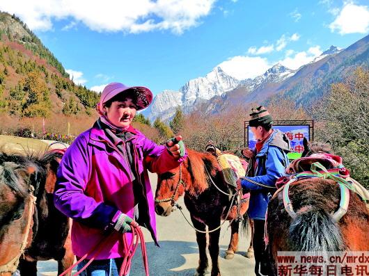 有“東方阿爾卑斯山”之稱的四姑娘山,位于四川阿壩藏族羌族自治州小金縣境內(nèi),與“大熊貓的故鄉(xiāng)”——臥龍自然保護(hù)區(qū)接壤。由于生態(tài)環(huán)境保護(hù)的特殊性,不少觀光地點(diǎn)車輛無法進(jìn)入,只能徒步穿越或者騎馬進(jìn)山,馬匹具有十分重要地位。“一開始,我一個人牽馬,沒有統(tǒng)一的組織和管理,一天有時候只能掙三四十元,有的游客還擔(dān)心是否安全,不敢坐。”扎西告訴記者,村里統(tǒng)一管理以后,村民接受了專業(yè)培訓(xùn)、收費(fèi)透明,選擇坐馬穿越長坪溝和海子溝的游客越來越多。如今,長坪村有牽馬師700余人,牽馬成為村民重要的收入來源。