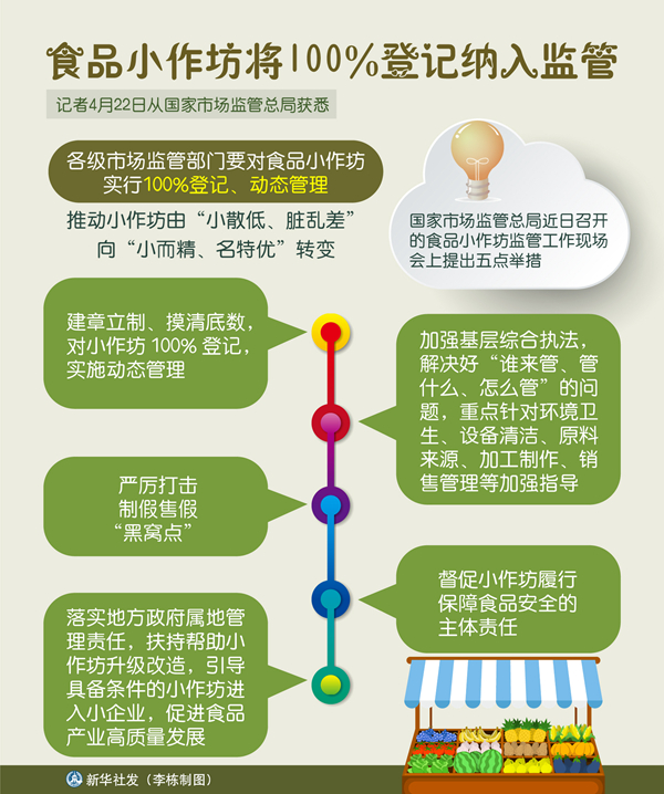新華社北京4月22日電(記者趙文君)記者22日從國家市場監(jiān)管總局獲悉,各級市場監(jiān)管部門要對食品小作坊實(shí)行100%登記、動態(tài)管理,推動小作坊由“小散低、臟亂差”向“小而精、名特優(yōu)”轉(zhuǎn)變。