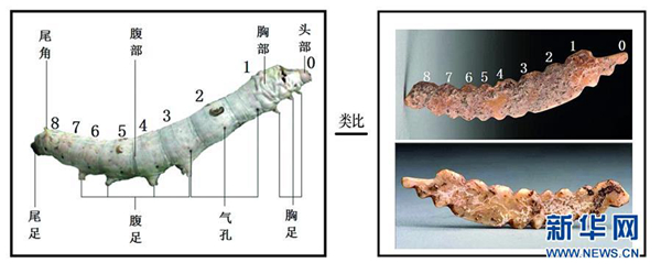 這是河南鞏義雙槐樹遺址出土的牙雕蠶與現(xiàn)代家蠶的比對圖(資料照片)。新華社發(fā)(鄭州市文物考古研究院提供)