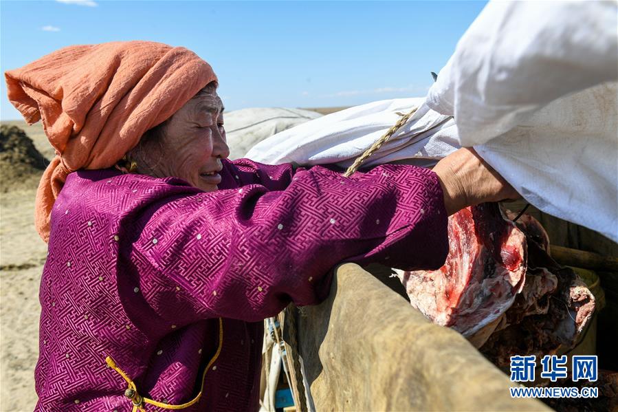 內蒙古自治區新巴爾虎左旗甘珠爾蘇木伊和呼熱嘎查牧民斯布格道爾吉從勒勒車上取出風干羊肉,為家人和羊倌準備午飯(4月10日攝)。新華社記者 彭源 攝