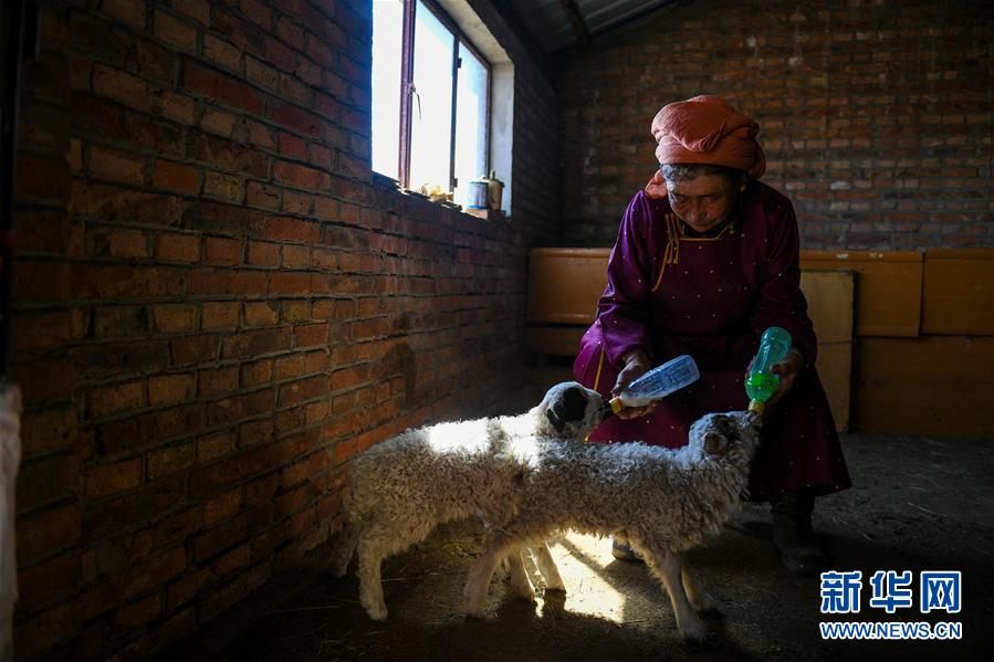內蒙古自治區新巴爾虎左旗甘珠爾蘇木伊和呼熱嘎查牧民斯布格道爾吉給小羊羔喂奶(4月10日攝)。新華社記者 彭源 攝