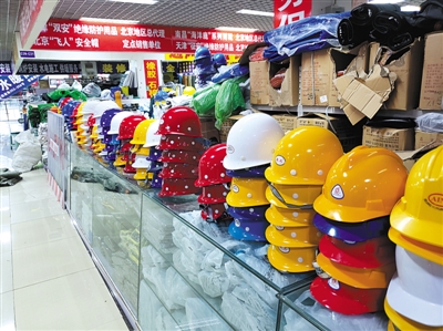 朝陽某大型建材市場內有各價位的安全帽出售,商家稱10余元的需求大。新京報記者 張熙廷 攝