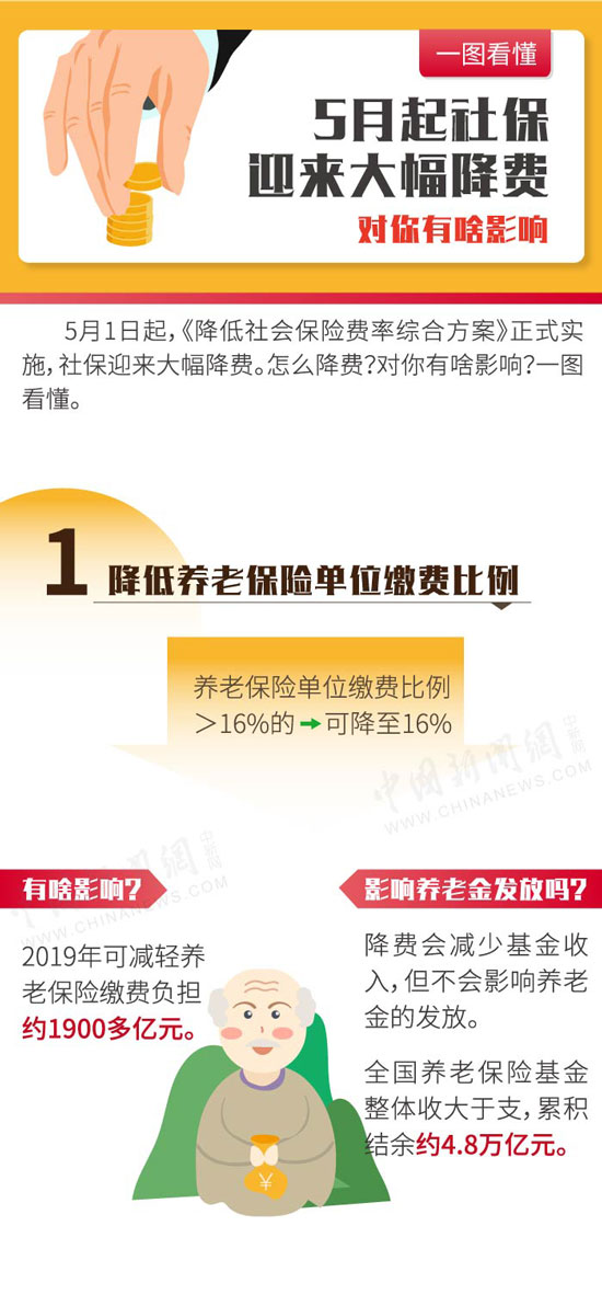 5月1日起,社保降費新政正式落地。此次社保降費能降多少?對企業(yè)和職工有啥影響?是否影響?zhàn)B老金發(fā)放?今年社保還有哪些大變化?一起來看。