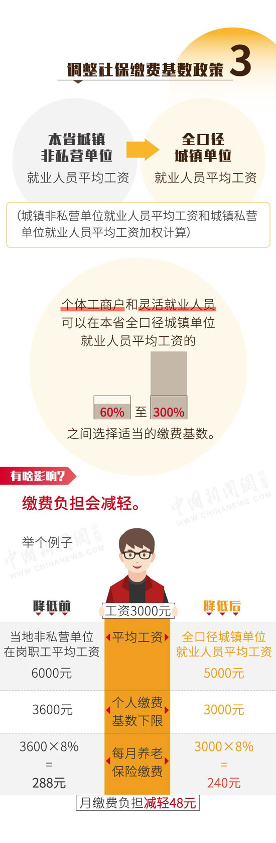 降費基方面,各省應(yīng)以本省城鎮(zhèn)非私營單位就業(yè)人員平均工資和城鎮(zhèn)私營單位就業(yè)人員平均工資加權(quán)計算的全口徑城鎮(zhèn)單位就業(yè)人員平均工資,核定社保個人繳費基數(shù)上下限,合理降低部分參保人員和企業(yè)的社保繳費基數(shù)。