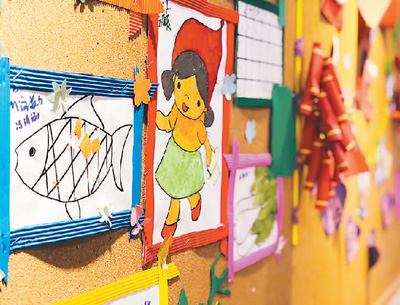 在北京五彩鹿高碑店校區的走廊墻壁上,張貼著自閉癥譜系障礙兒童的繪畫作品。畫筆下藏著孩子心中五彩斑斕的世界。記者 孫亞慧攝