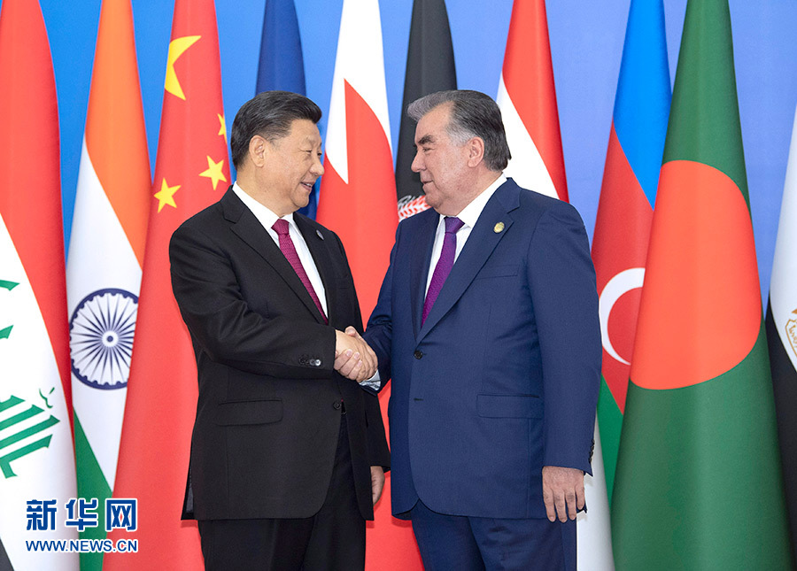 6月15日,亞洲相互協(xié)作與信任措施會(huì)議第五次峰會(huì)在塔吉克斯坦首都杜尚別舉行。國(guó)家主席習(xí)近平出席峰會(huì)并發(fā)表重要講話。這是習(xí)近平抵達(dá)納烏魯茲宮迎賓廳,受到塔吉克斯坦總統(tǒng)拉赫蒙熱情迎接。 新華社記者 沙達(dá)提 攝