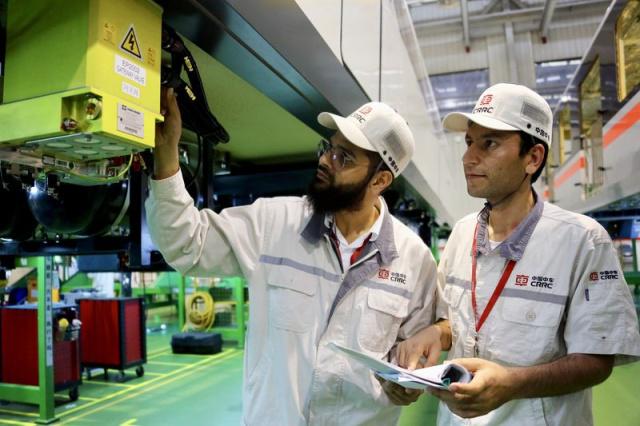 中車株機(jī)公司巴基斯坦籍員工可汗和阿哈在做機(jī)車工藝檢測。(中車株機(jī)公司李歆彧供圖)