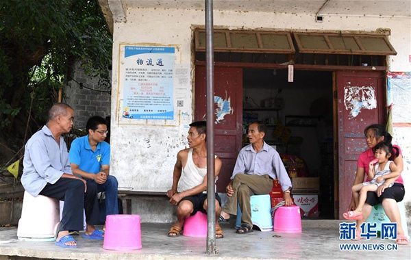 楊杰興(左)在廣西樂業(yè)縣百坭村與村民班龍排拉家常(8月1日攝)。新華社記者 周華 攝