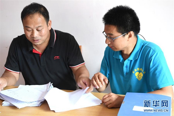 楊杰興(右)在廣西樂業(yè)縣百坭村村委會辦公室和同事商量工作(8月1日攝)。新華社記者 周華 攝