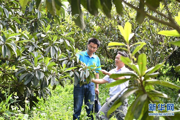 楊杰興(左)在廣西樂業(yè)縣百坭村實(shí)地了解村里枇杷產(chǎn)業(yè)發(fā)展情況(8月1日攝)。新華社記者 周華 攝