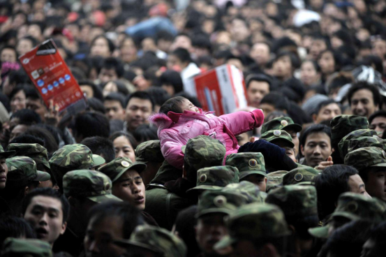 ↑2008年2月1日,武警戰士從廣州火車站密密麻麻的人群中把一個孩子手遞手托舉出來。新華社發