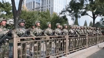 這是繼今年10月1日國慶盛典時“兵哥哥”們向女排姑娘致意之后,兩大“天團”再次互動。