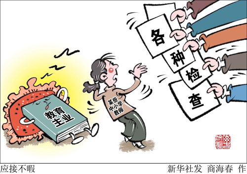 事實(shí)上,早在今年3月中辦就發(fā)布《關(guān)于解決形式主義突出問題為基層減負(fù)的通知》,強(qiáng)調(diào)今年要解決一些困擾基層的形式主義問題,切實(shí)為基層減負(fù)?!靶氯A視點(diǎn)”記者近日調(diào)查發(fā)現(xiàn),在一些地方的中小學(xué),各種檢查以及與教學(xué)無(wú)關(guān)的活動(dòng)紛紛進(jìn)校園,令教師們不堪重負(fù)甚至影響了教學(xué)工作。