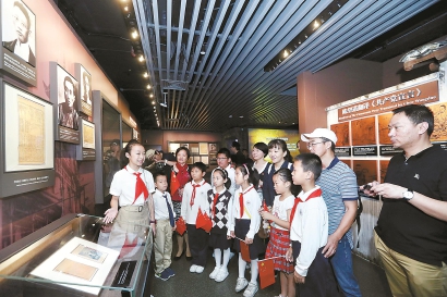 中共一大會址紀念館小小講解員、00后潘夢婕(左),為觀眾講述《忠誠源于信仰——一座衣冠冢的傳奇》。 蔣迪雯 攝