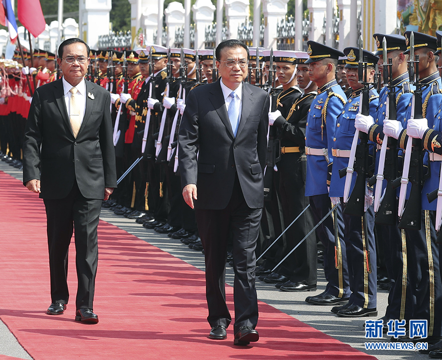 會(huì)談前,巴育在總理府前廣場(chǎng)為李克強(qiáng)舉行隆重歡迎儀式。兩國(guó)總理登上檢閱臺(tái),軍樂隊(duì)高奏中泰兩國(guó)國(guó)歌。李克強(qiáng)在巴育陪同下檢閱了儀仗隊(duì)。