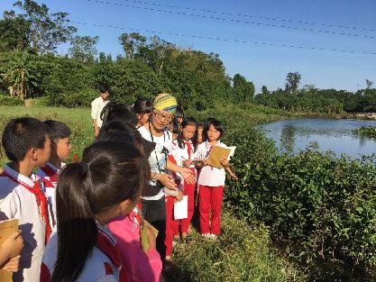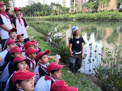 海南松鼠學堂創始人高高老師帶領??谄咧械膶W生觀察濕地的生態環境