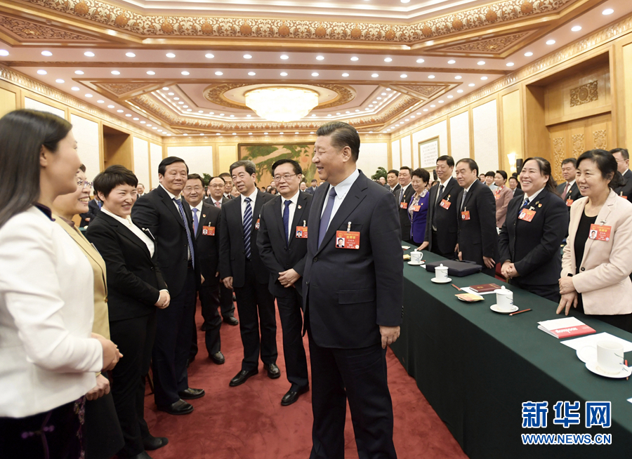 3月8日,中共中央總書記、國家主席、中央軍委主席習近平參加十三屆全國人大二次會議河南代表團的審議。在“三八”國際勞動婦女節到來之際,習近平代表黨中央,向參加全國兩會的女代表、女委員、女工作人員,向全國各族各界婦女,致以節日的祝賀和美好的祝福。這是習近平同女代表親切交談。新華社記者 李學仁 攝