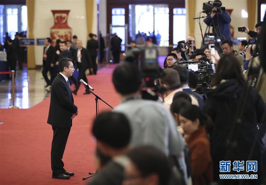 3月12日,十三屆全國人大二次會議在北京人民大會堂舉行第三次全體會議。這是國家知識產權局局長申長雨在“部長通道”接受采訪。 新華社記者金立旺攝