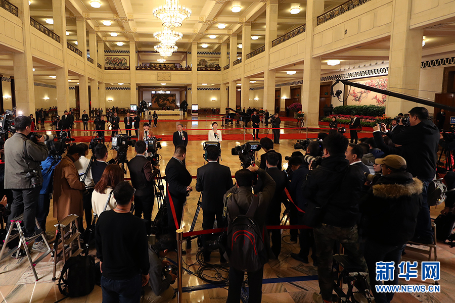 3月15日,十三屆全國人大二次會議在北京人民大會堂舉行閉幕會。圖為全國人大代表在“代表通道”接受采訪。新華網/中國政府網 陳杰 攝