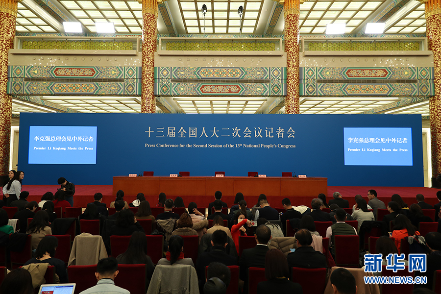 3月15日上午十三屆全國人大二次會議閉幕后,國務院總理李克強在人民大會堂三樓金色大廳會見采訪十三屆全國人大二次會議的中外記者并回答記者提出的問題。圖為記者會現場。