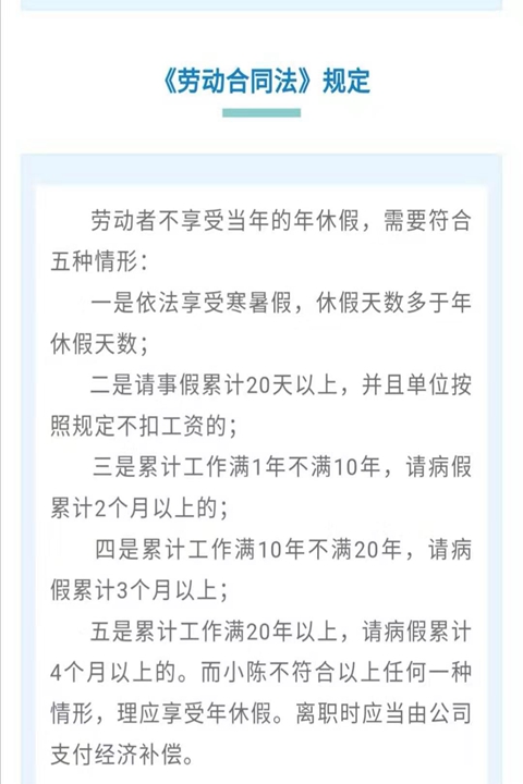 未休年假能要求經(jīng)濟補償嗎?人社部官方微信2日發(fā)布案例,小陳2018年和公司解除了合同,公司依法支付了經(jīng)濟補償。小陳認為,他工作已滿10年不滿20年,在2018年還有10天的帶薪年休假,由于工作原因沒休成,要求公司對未休年休假支付相應補償。此訴求最終獲得仲裁委支持。(李金磊)