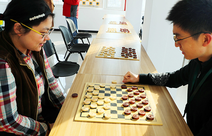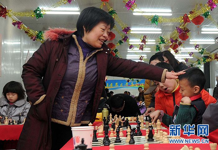 2014年2月4日,國際象棋世界冠軍謝軍(左)在龍潭廟會活動現場與一位小朋友交流。(圖片來源:新華社 記者 公磊攝)