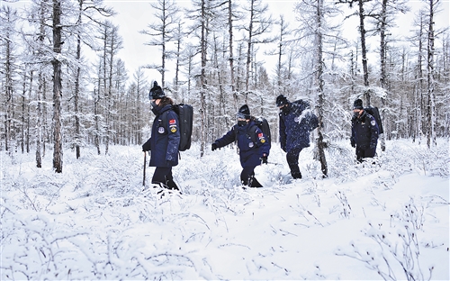 1月24日,內蒙古阿龍山森林公安局“90后”女森林警察李慧與同事在大興安嶺原始林區踏雪巡邏。當日最低氣溫降至-46℃,極低的氣溫使民警們的圍巾、帽子結滿冰霜。她們守護著大興安嶺腹地森林,每天驅車近百公里,徒步30余公里,保護著轄區內的野生動植物資源,維護著林區社會治安秩序。 王 偉攝(中經視覺)