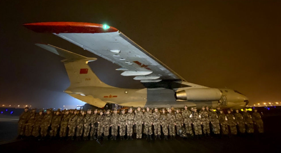 1月24日晚,由陸軍軍醫大學抽調精干醫務人員組建的醫療隊在重慶江北國際機場停機坪集結,準備連夜馳援武漢。 新華社發