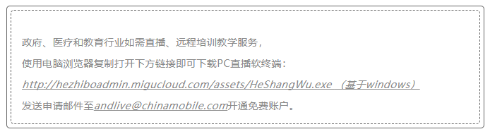 中國移動教育名師直播課堂免費提供在線課程學習和遠程直播教學平臺,掃碼可領取可免費課程資源,使用直播能力可撥打4001100868。中國移動企業和商務直播為政府、醫療和教育行業提供直播、遠程培訓教學服務,符合條件的用戶可使用直播普及疫情防控知識,或使用電腦進行遠程培訓教學等。