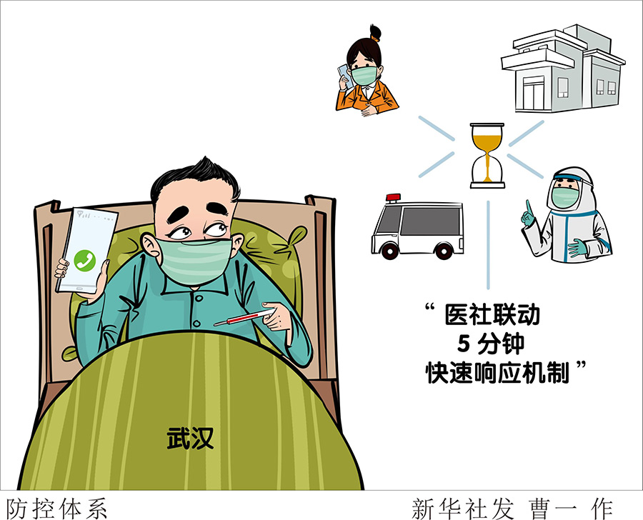 武漢青山區鋼花村街110社區書記馮丹介紹稱,鋼花村街制定了“醫社聯動5分鐘快速響應機制”:遇到有居民反映相關癥狀時,社區工作人員第一時間通報社區衛生服務中心,值班醫生5分鐘內電話聯系疑似患者或家屬,作出是否需要上門診斷或轉診的預判,并反饋社區;醫生判斷不需上門的,由社區網格員指導居民居家觀察;醫生判斷需要上門的,則由社區申請應急車,先到社區衛生服務中心接醫護人員,再會同社區工作者上門,將患者及醫護人員送往發熱門診。