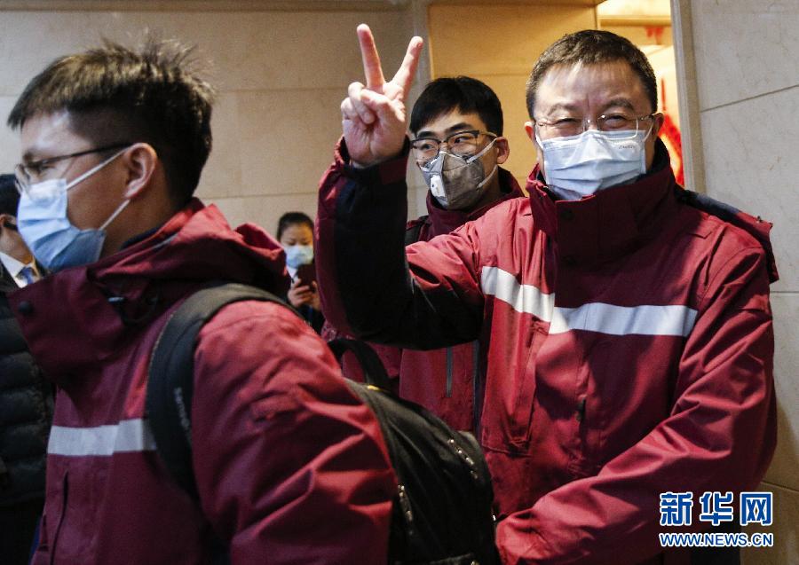 2月1日,中日友好醫(yī)院黨委書記周軍(右一)在出發(fā)前做出勝利的手勢(shì)。當(dāng)日,為進(jìn)一步加強(qiáng)武漢新型冠狀病毒感染的肺炎危重癥患者救治工作,國(guó)家衛(wèi)生健康委緊急組派中日友好醫(yī)院、北京大學(xué)第一醫(yī)院、北京大學(xué)人民醫(yī)院、北京大學(xué)第三醫(yī)院院長(zhǎng)或書記帶領(lǐng)本院重癥醫(yī)學(xué)科主任、護(hù)士長(zhǎng)等專業(yè)人員奔赴武漢,和前期組派的專業(yè)醫(yī)務(wù)人員一起開展危重癥患者救治工作。 新華社記者 張玉薇 攝