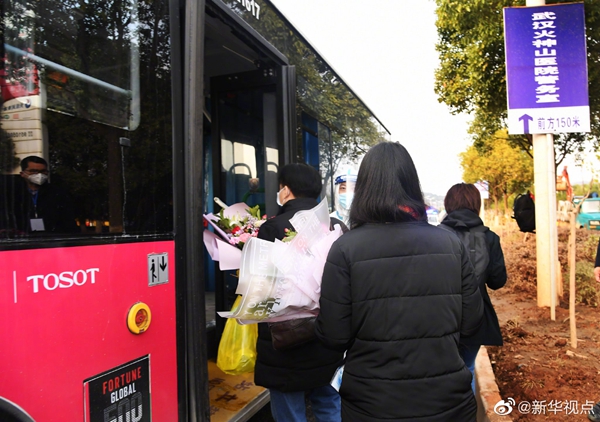 經過火神山醫院醫護人員的精心診治,首批7名符合出院標準的新冠肺炎確診患者13日下午出院。火神山醫院籌備工作指揮部統一安排車輛將患者分別送回所居住小區門口。