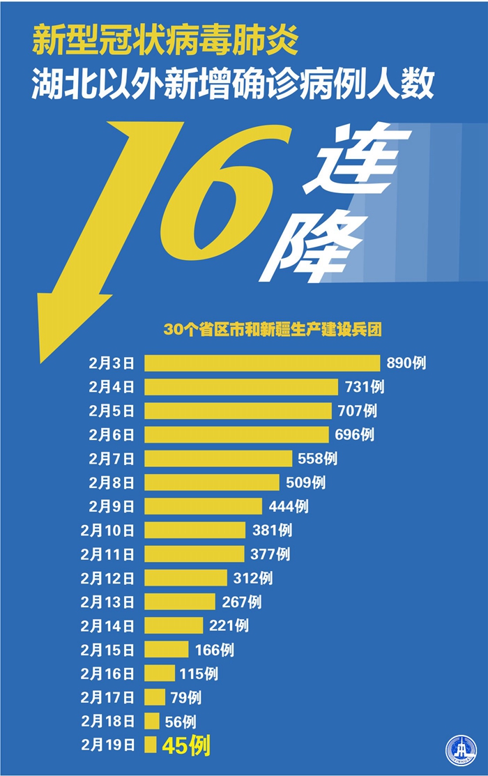截至2月19日24時,據31個省(自治區、直轄市)和新疆生產建設兵團報告,現有確診病例56303例(其中重癥病例11864例),累計治愈出院病例16155例,累計死亡病例2118例,累計報告確診病例74576例(江西、河南、云南省各核減1例),現有疑似病例4922例。累計追蹤到密切接觸者589163人,尚在醫學觀察的密切接觸者126363人。