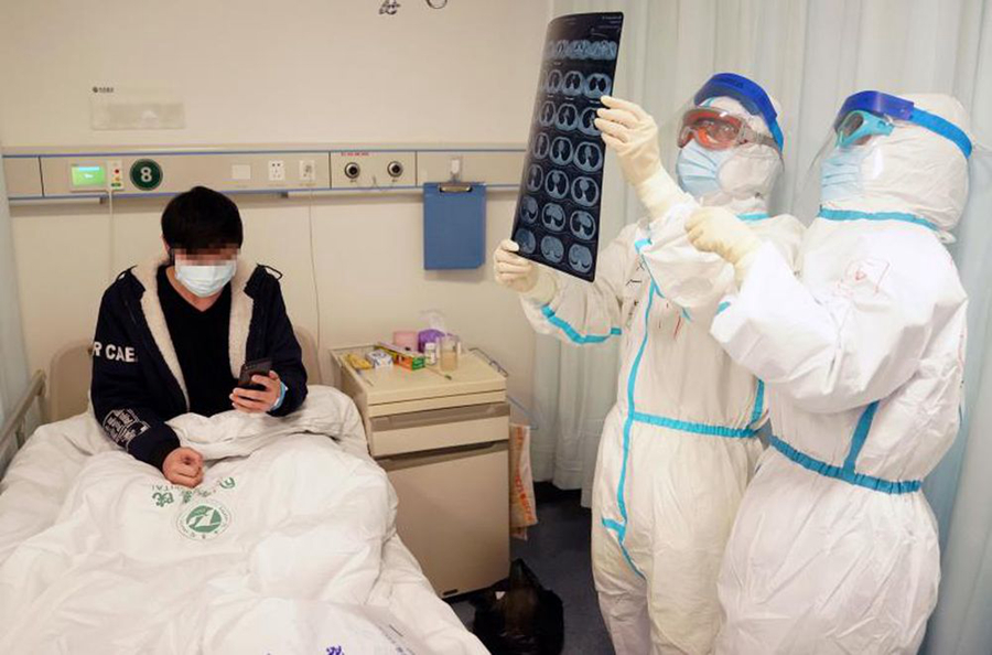 2月18日,專家趙建平(右二)與醫生周瑩在同濟醫院中法新城院區新冠肺炎重癥病區,一起觀看患者的CT片。新華社記者王毓國 攝