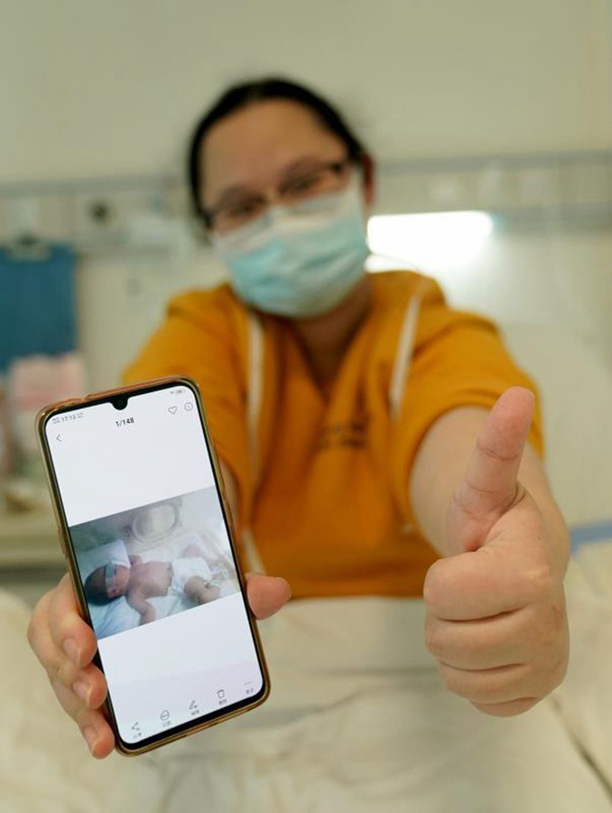 2月18日,楊女士展示手機中自己兒子的照片。在武漢華中科技大學同濟醫院中法新城院區新冠肺炎重癥病區住院的楊女士是武漢人,在身患新冠肺炎后剖腹產下一名男嬰。嬰兒目前在醫院進行隔離觀察,但各項指標均正常。當楊女士知道孩子的情況后,懸著的心終于放下。在醫護人員的努力下,她的病情也有了好轉。新華社記者王毓國 攝