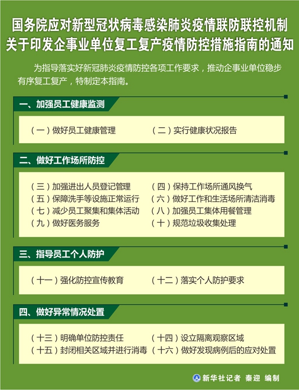 指南提出,各單位一要加強(qiáng)員工健康監(jiān)測。切實掌握員工流動情況,按照當(dāng)?shù)匾蠓謪^(qū)分類進(jìn)行健康管理,對來自疫情嚴(yán)重地區(qū)的人員實行居家或集中隔離醫(yī)學(xué)觀察。對處在隔離期間和入住集體宿舍的員工,每日進(jìn)行2次體溫檢測。設(shè)立可疑癥狀報告電話,員工出現(xiàn)發(fā)熱、呼吸道癥狀時,要及時向本單位如實報告。每天匯總員工健康狀況,向當(dāng)?shù)丶部夭块T報告。二要做好工作場所防控。加強(qiáng)進(jìn)出人員登記管理,指派專人對進(jìn)出單位和宿舍的所有通道進(jìn)行嚴(yán)格管理。保持工作場所通風(fēng)換氣,在條件允許情況下首選自然通風(fēng)。工作場所應(yīng)設(shè)置洗手設(shè)備,洗手、噴淋設(shè)施應(yīng)保持正常運(yùn)行。做好工作和生活場所清潔消毒。減少員工聚集和集體活動,減少召開會議,需要開的會議要縮短時間、控制規(guī)模,保持會議室空氣流通,提倡召開視頻或電話會議。加強(qiáng)員工集體用餐管理,適當(dāng)延長食堂供餐時間,實行錯峰就餐。做好醫(yī)務(wù)服務(wù),設(shè)立醫(yī)務(wù)室的單位要調(diào)配必要的藥物和防護(hù)物資。未設(shè)立醫(yī)務(wù)室的單位應(yīng)當(dāng)就近與醫(yī)療機(jī)構(gòu)建立聯(lián)系。規(guī)范垃圾收集處理,在公共區(qū)域設(shè)置口罩專用回收箱,加強(qiáng)垃圾箱清潔,定期進(jìn)行消毒處理。加強(qiáng)垃圾分類管理,及時收集并清運(yùn)。三要指導(dǎo)員工個人防護(hù)。強(qiáng)化防控宣傳教育,采用多種形式加強(qiáng)復(fù)工復(fù)產(chǎn)后疫情防治知識科普宣傳。落實個人防護(hù)要求,員工要減少不必要外出,避免去人群聚集尤其是空氣流動性差的場所;在人員密集場所應(yīng)按照《不同人群預(yù)防新型冠狀病毒感染口罩選擇和使用技術(shù)指引》要求,正確佩戴口罩等防護(hù)用品。